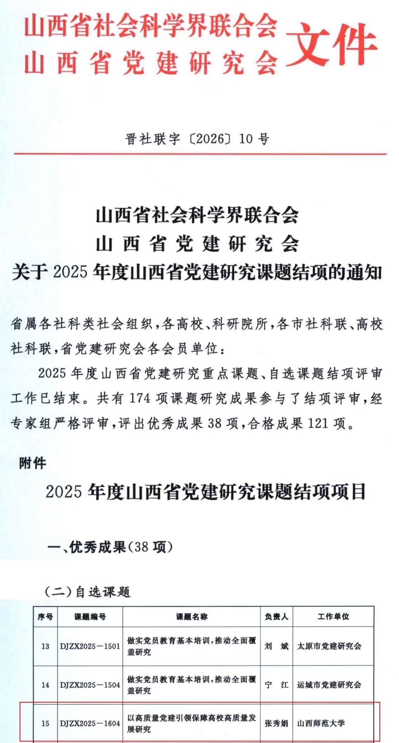 近日,山西省社会科学界联合会、山西省党建研究会公布了2025年度山西省党建研究课题结项评审结果。由我院教师张秀娟主持的《以高质量党建引领保障高校高质量发展研究》在参与结项的174项课题中脱颖而出,获评“优秀成果”。
